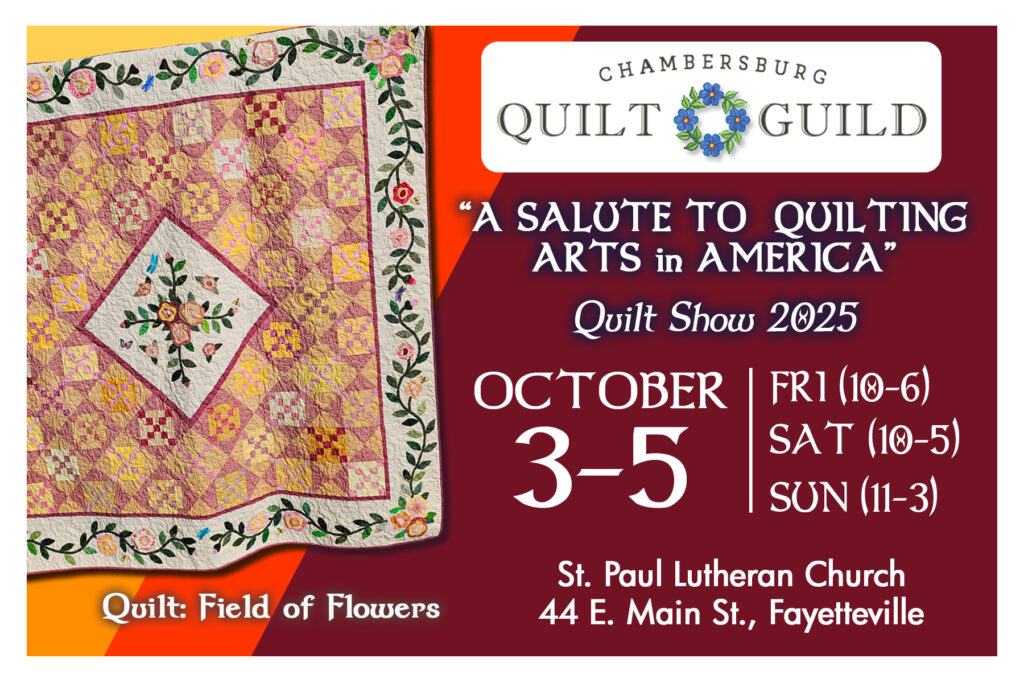 A presentation by the Chambersburg Quilt Guild, will take place on October 3-5, at St. Paul’s Lutheran Church,44 E. Main St., Fayetteville, PA! The Quilt Show will feature a tremendous collection of quilted art, handmade Boutique items, quilting demos, a stellar raffle quilt, and will contain a beautiful collection of new patriotic quilts in honor of America’s 250th Anniversary! Don’t miss it!!!